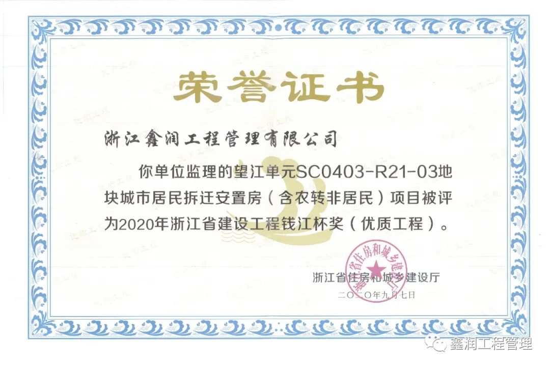 建筑工程質(zhì)量不僅事關(guān)居民生活品質(zhì),還與城市的未來與傳承息息相關(guān)。近日,浙江省住房和城鄉(xiāng)建設(shè)廳頒發(fā)了2020年度浙江省建設(shè)工程錢江杯獎(jiǎng)(優(yōu)質(zhì)工程)榮譽(yù)證書和獎(jiǎng)牌。由浙江鑫潤(rùn)工程管理有限公司監(jiān)理的望江單元SC0403-R21-03地塊城市居民拆遷安置房(含農(nóng)轉(zhuǎn)非居民)項(xiàng)目(以下簡(jiǎn)稱“望江安置房”)獲此殊榮。