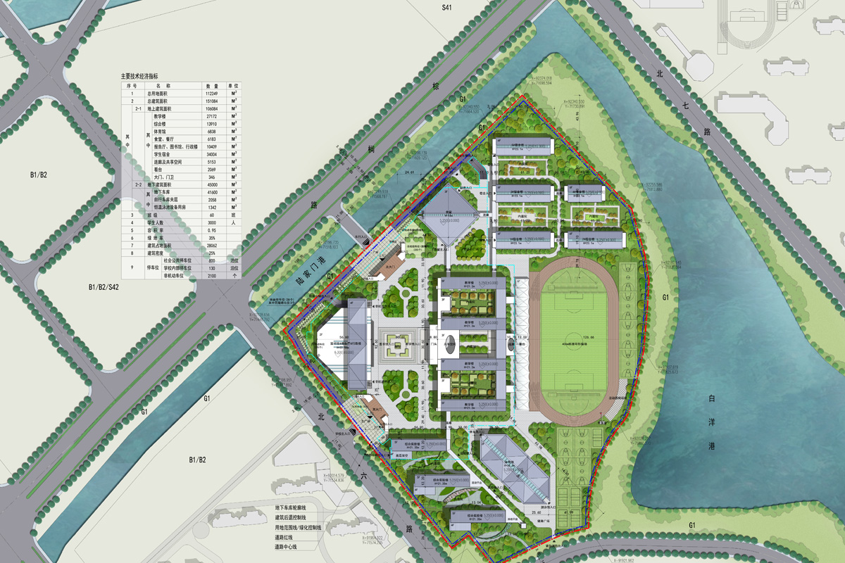 該項目位于良渚街道勾莊村棕櫚路以南,總建筑面積約151192.39㎡,其中地上建筑面積為106078.24㎡,地下建筑面積約為45114.15㎡,主要建設內容包括教學樓、科技綜合樓、多功能報告廳、圖書館、體育樓、宿舍樓、食堂、操場、道路廣場、地下車庫及其他相關配套附屬設施等。